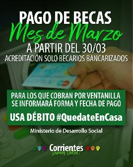 El Ministerio de Desarrollo Social de la Provincia, a cargo de Adán Gaya, informa que las liquidaciones a beneficiarios de becas correspondiente a marzo de 2020, estarán acreditadas y disponibles a través de cajeros automáticos a partir de este lunes 30 de marzo.