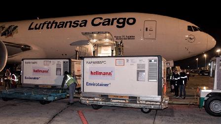 También cerca de la medianoche llegaron al país, en un vuelo de la empresa Lufthansa, 819.200 dosis de la vacuna Sinopharm, de la cual en el transcurso de la semana llegarán un total de 2.304.000 de dosis que se completarán con un envío de 716.800 a primera hora de mañana jueves y otro de 768.000 el sábado.