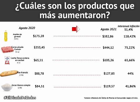 INFLACION ¿Cuáles Son Los Productos Que Más Aumentaron En El último Año? El pasado martes 14, el Instituto Nacional de Estadística y Censos (Indec) dio a conocer el índice de precios al consumidor (IPC) de agosto en el NEA con una inflación del 2,7 por ciento. Mientras que a nivel país rondó en el 2,5 por ciento, y en la interanual del 51,4 por ciento. Según el ministro de Economía, Martín Guzmán se tuvo una desaceleración en los precios en los últimos meses. Sin embargo, en este período algunos productos básicos de la canasta sufrieron un importante incremento en su costo. En este sentido, EL LIBERTADOR realizó un relevamiento de los cinco alimentos de la mesa de los correntinos que mayor impacto tuvieron en la góndola durante los pasados 365 días. De esta misma manera, se concretó un enfoque en el cuadro ilustrativo con el aceite de girasol, arroz blanco, leche entera fresca en sachet, carne picada común, y el pan francés. Los casos más notables se dieron en el aceite de girasol de 1,5 litros con el 118.42 por ciento de aumento en un año, y seguido el kilo de carne molida común con el 75.22 por ciento. Es decir, por encima de la inflación anual detallado anteriormente. |